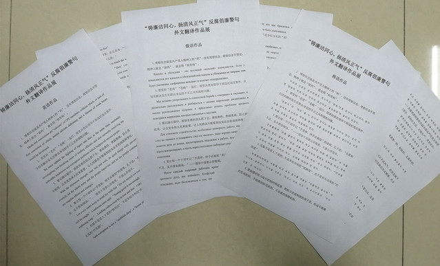 作为学院“党建+专业”建设活动的一部分,本次活动以习近平从严治党方略中关于理想信念、工作作风、从严治吏、监督落实、正风反腐、制度约束等六个方面的十八句警句为本,面向全院征集外文翻译,得到广大师生党员的积极响应与踊跃投稿,征集到英语、俄语、朝鲜语翻译作品65篇,根据译文忠实度、语法逻辑性及行文规范性,共评选出英语、俄语、朝鲜语优秀翻译作品20篇。