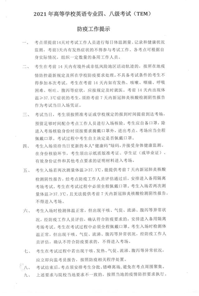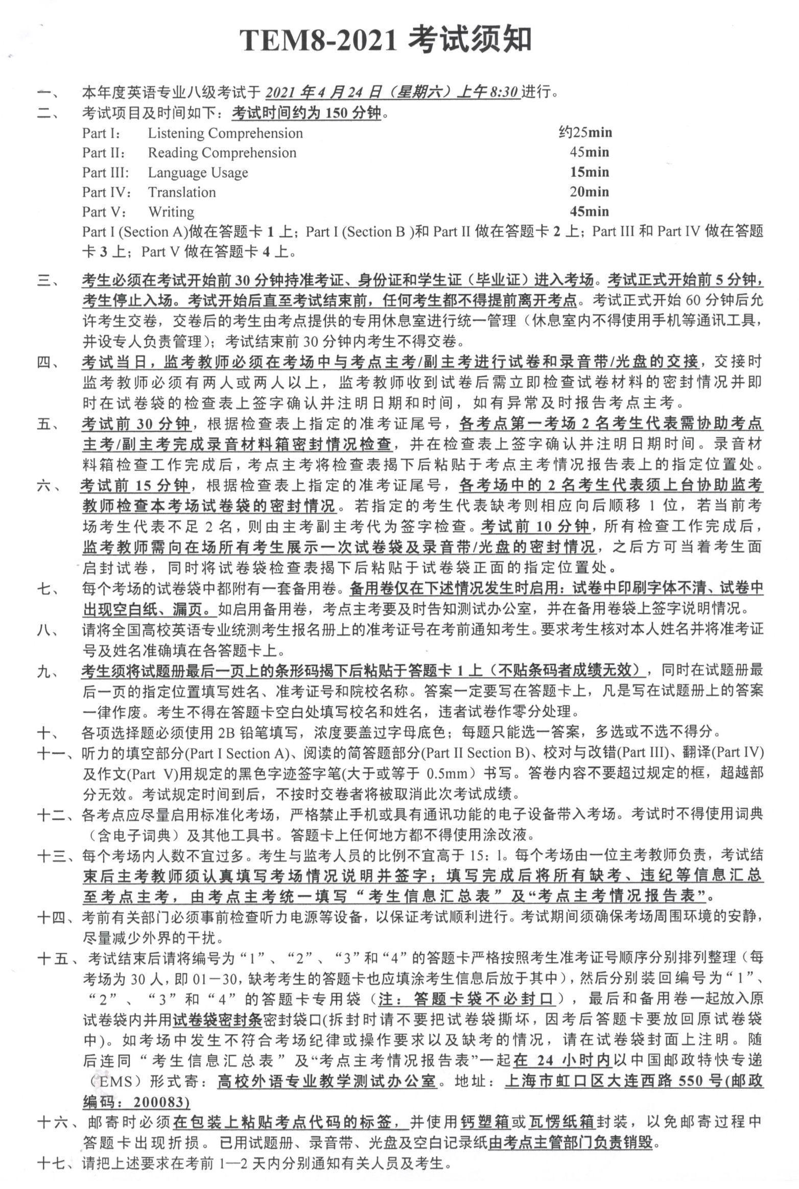 2021年英语专业八级笔试(简称TEM)将于4月24日(周六) 8:30-11:00举行,考试时间约为150分钟。现就考试准备工作的有关事项通知如下: