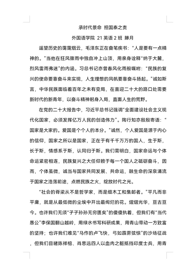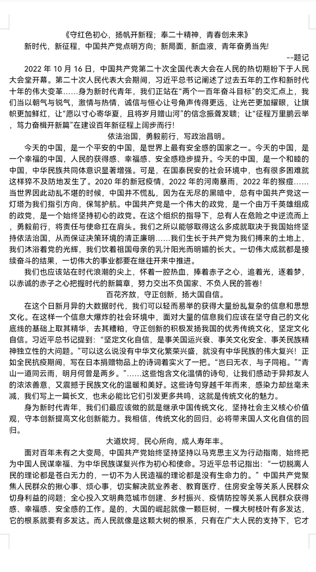 本次比赛分为征文比赛与演讲比赛。在征文比赛中,我院收到了大量优秀来稿。在参赛选手们的文章中,他们以“党的二十大和我的人生路”的青春使命教育为主题并紧随时事,联系实际,讲述着中国共产党领导下新时代青年们奋发向上的故事,表达了对党的热爱和赞颂;在演讲比赛中,选手们围绕“奋进新征程,青春勇担当”的主题,以各具特色的风格、自信从容的表现,诠释了对青春、对时代使命和对中国梦的理解。经过激烈的角逐,评委老师秉着公平公正的原则,于两场赛程中分别选出了一等奖一名,二等奖两名,三等奖两名。