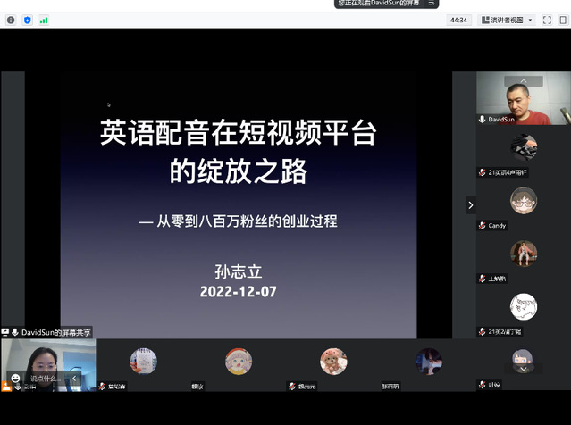 根据7790cnm必发集团集中实训工作安排,为进一步提高学生对英语配音实践的认识,我院于12月7日邀请了著名职业英语配音员孙志立老师为21级英语专业学生做了一场主题为“英语配音在短视频平台的绽放之路”的线上专题讲座。