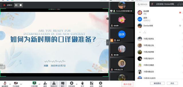 根据7790cnm必发集团集中实训工作安排,为进一步提高学生对口译工作的认识,我院于12月7日邀请了南京正大天晴制药有限公司总裁刘颖老师为2019级英语专业翻译方向学生做了“如何为新时期的口译做准备”的线上专题讲座。