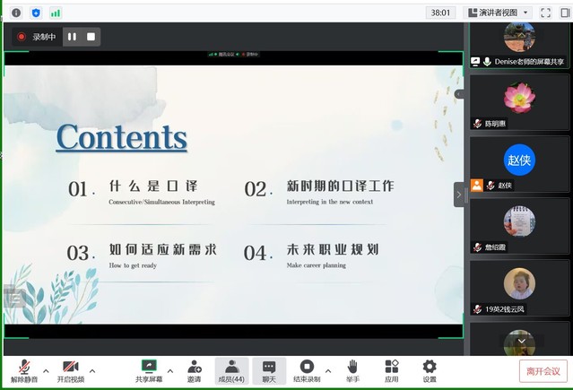 本次讲座紧扣当前新冠疫情社会形势,围绕“远程口译——中国会议口译新模式”展开,涉及远程口译的发展和特征,探讨了新冠疫情下中国远程口译的现状,分析了译员的应对策略,对新时期口译人才培养具有重要的借鉴意义。在最后的答疑环节,刘老师与参会的师生就远程口译模块和虚拟仿真教学等方面展开了热烈讨论和互动。