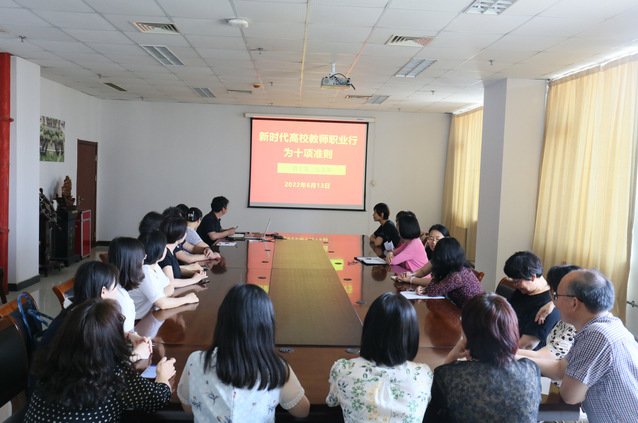 近日,7790cnm必发集团教工第二党支部组织学习《新时代高校教师职业行为十项准则》。支部全体党员、英语专业教师参加会议。支部书记、英语专业教研室主任潘冬带头领学。