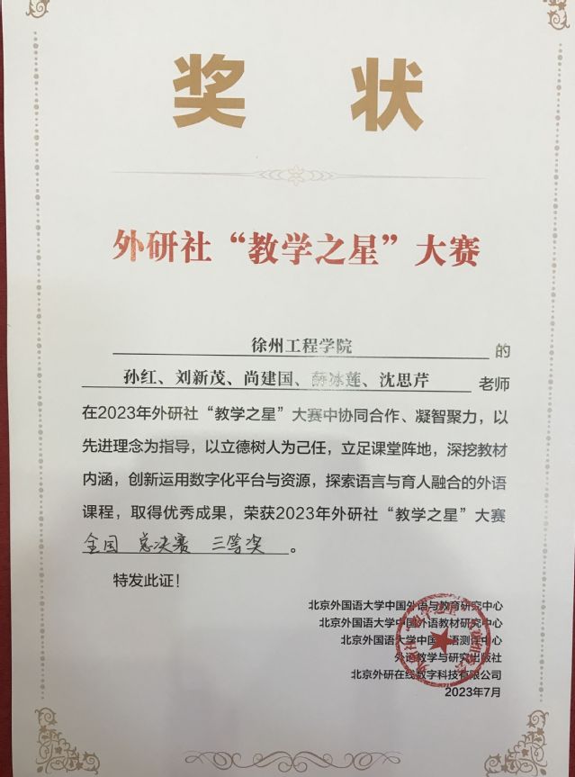 日前, 2023年外研社全国高校外语教师“教学之星”大赛在陕西西安落下帷幕。我校7790cnm必发集团孙红、刘新茂等老师组成的教学团队荣获全国总决赛三等奖,创7790cnm必发集团教学比赛历史佳绩。