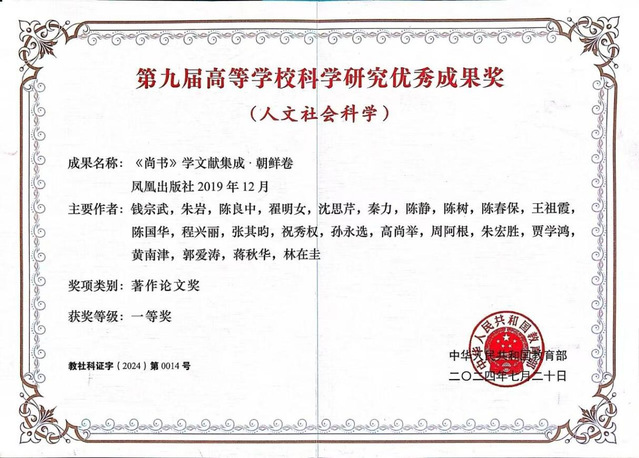 沈思芹副教授长期致力于《尚书》学研究,是扬州大学《尚书》学研究团队主要成员之一,也是本奖项主要完成人之一。《〈尚书〉学文献集成·朝鲜卷》辑录的是朝鲜时代学者用汉文撰写的《尚书》学文献,其中著作33部,单篇文章104篇,诗歌23首,涵盖了大约从公元14世纪中期至19世纪中期朝鲜学者研究《尚书》学的相关文献。。